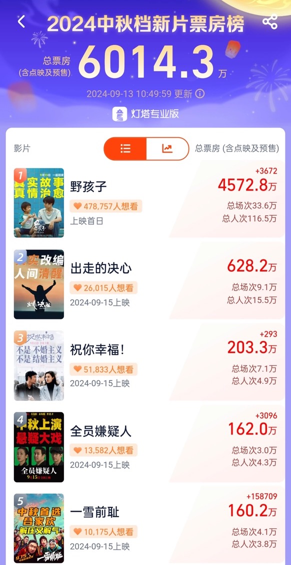 2024中秋档新片预售票房突破6000万,《新生》票房破4亿 — 最新往事