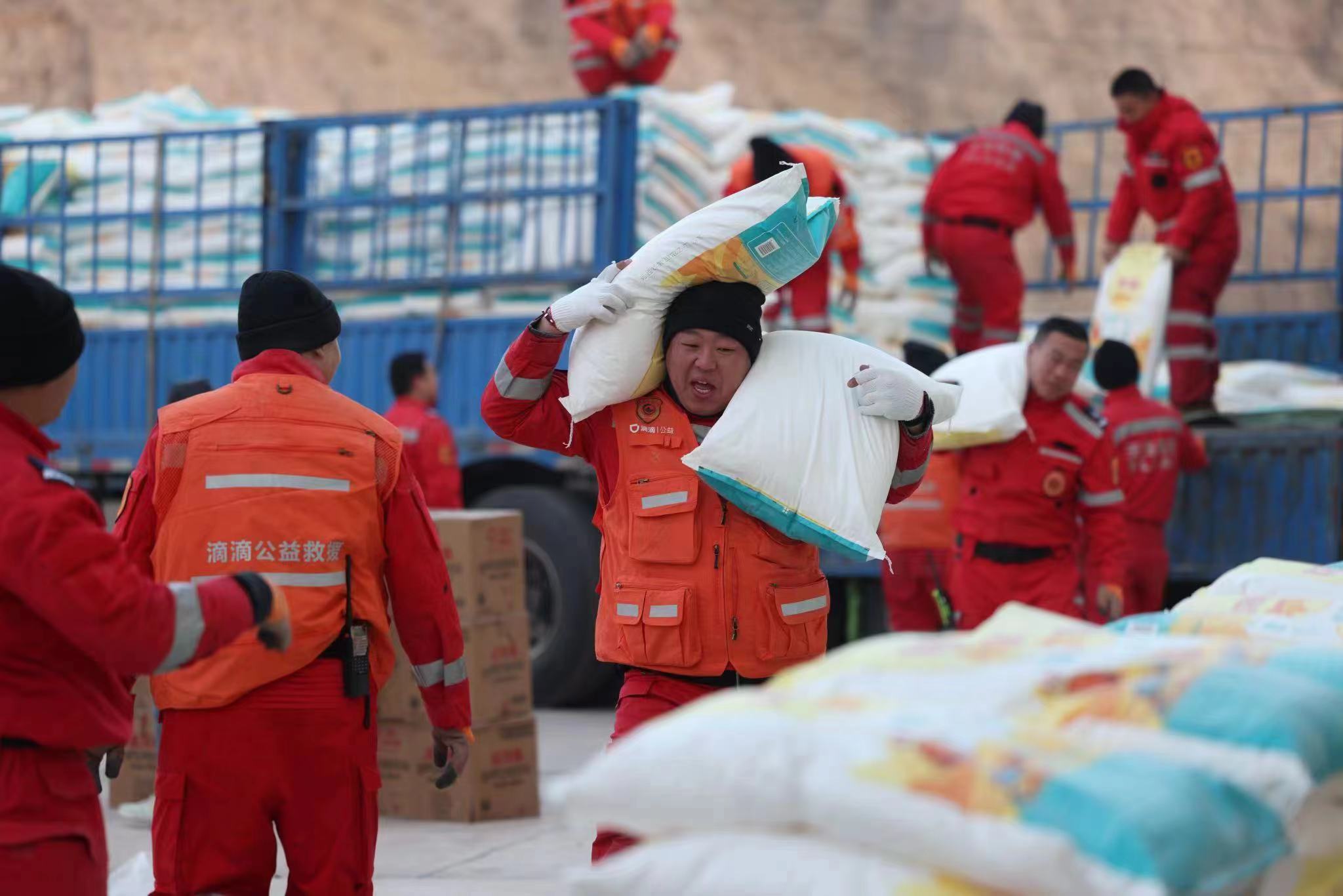 2023年12月,“滴滴公益营救队”队员在甘肃积石山救灾货仓,实现面粉、折叠床、棉被、棉帐篷等物资的卸货使命。 受访者供图